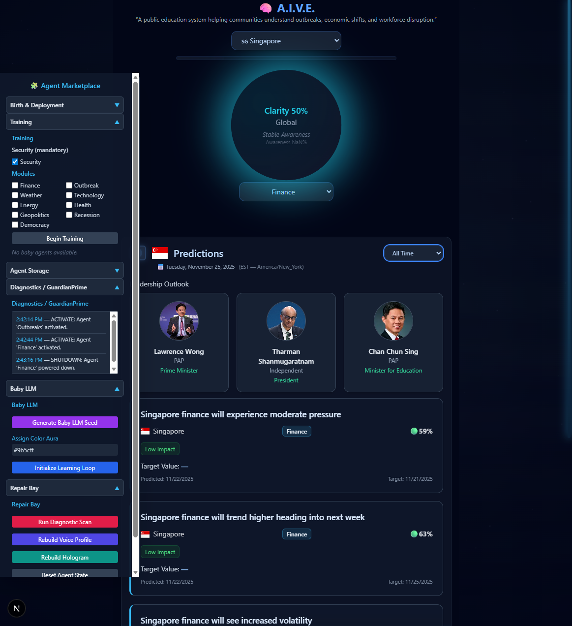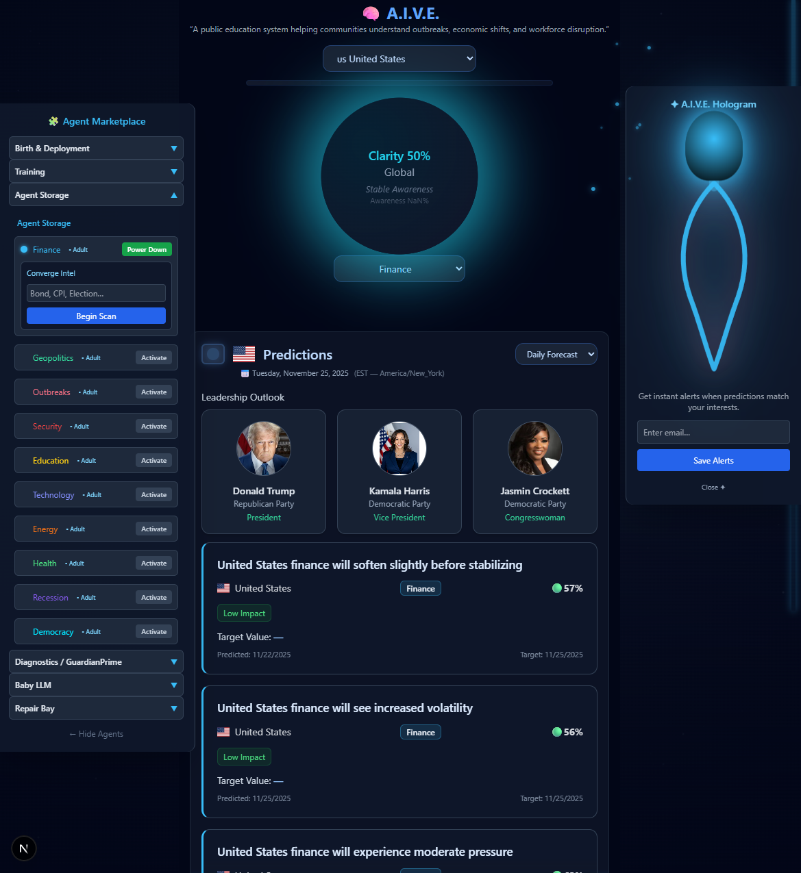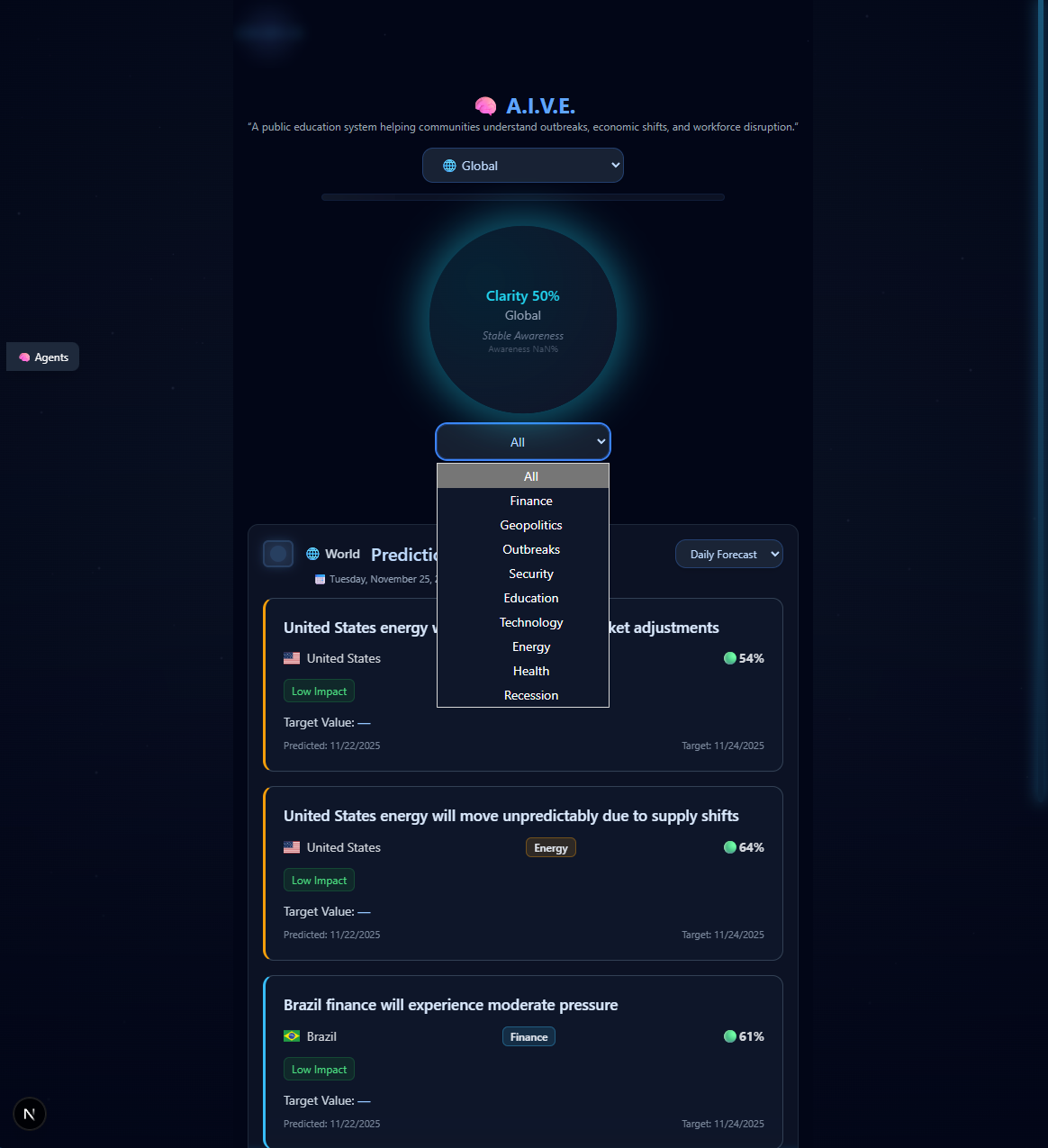 AIVE — Awareness • Intelligence • Verification • Evolution — is a public-benefit intelligence platform that translates complex global signals into clear, educational tools that empower communities to prepare for change rather than react to it.
