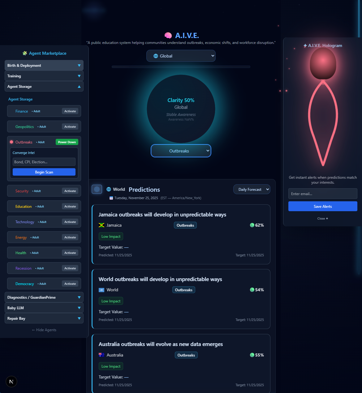 AIVE — Awareness • Intelligence • Verification • Evolution — is a public-benefit intelligence platform that translates complex global signals into clear, educational tools that empower communities to prepare for change rather than react to it.